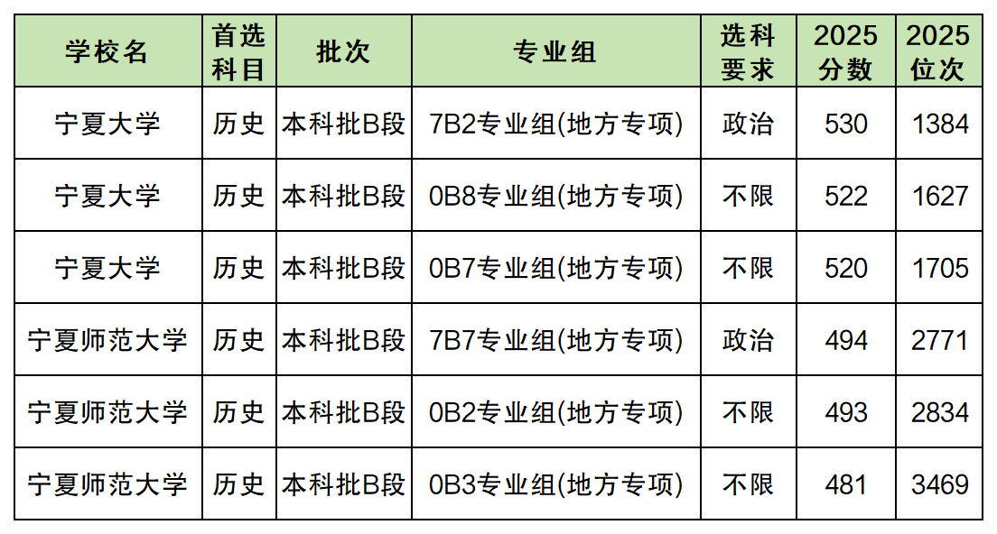 以下是2025年各大学地方专项计划在宁夏历史类的录取分数线一览表: