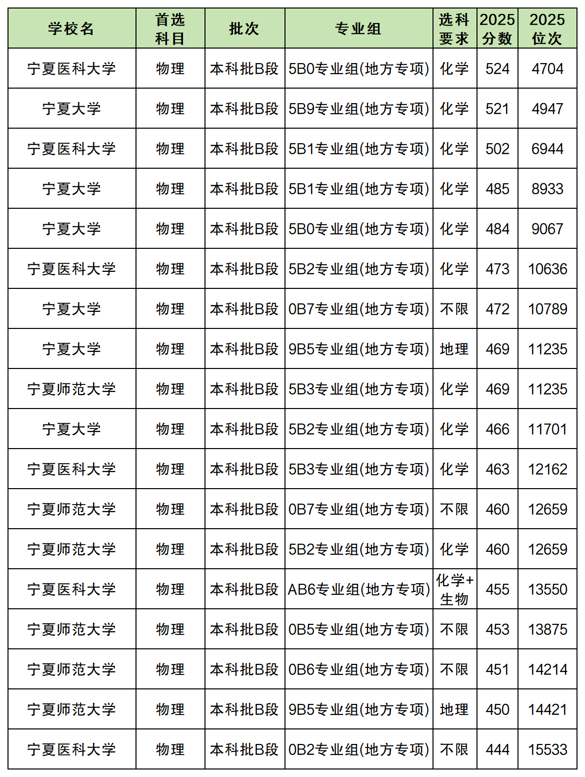 2025年各大学地方专项计划在宁夏物理类的招生专业组要多于历史类,物理类各大学地方专项计划各专业组的录取分数线在444分-524分之间;录取分数最高的是宁夏医科大学5B0专业组(地方专项),最低分为524分;录取分数最低的是宁夏医科大学0B2专业组(地方专项),2025最低分为444分。