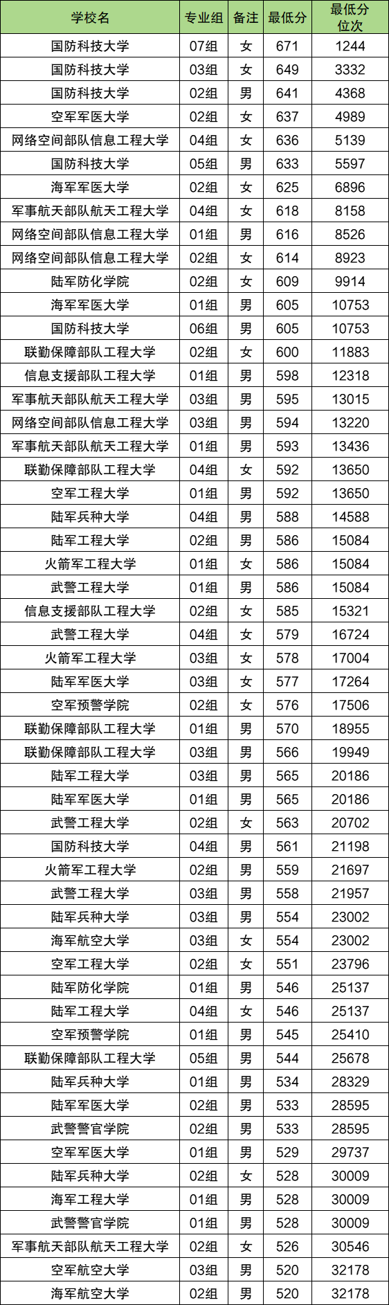 另外女生录取分数线最低的军校是军事航天部队航天工程大学,2025年最低分526分,位次是30546名;在男生中录取分数线最高的是国防科技大学02组,2025年最低分641分,位次是4368名。