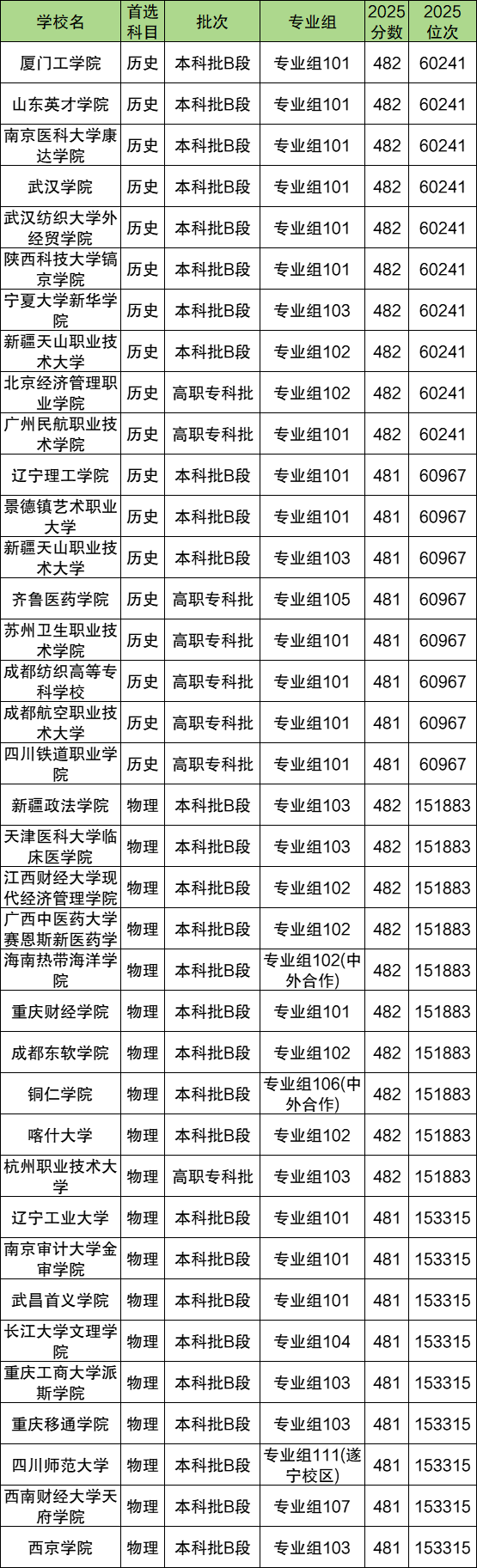 历史组480分可以稳上民办本科高校,比如宁波大学科学技术学院101组、武昌工学院101组、西南财经大学行知学院101组等,也可稳上部分比较好的专科批录取公办大学,比如四川邮电职业技术学院101组等。