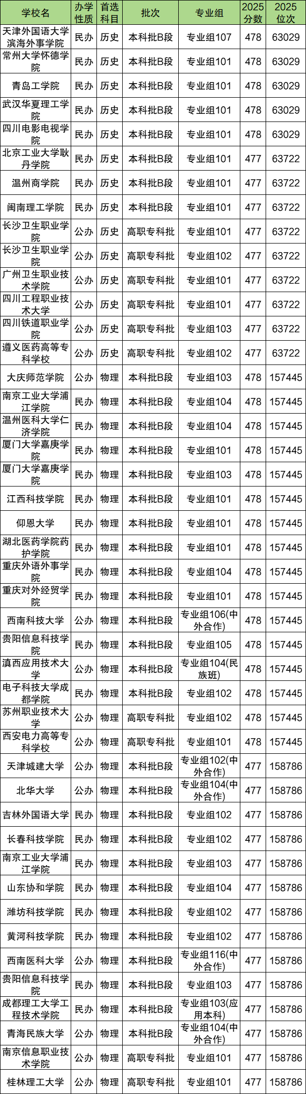 下面是2025年480分能保底的大学名单展示(录取分477分-478分):