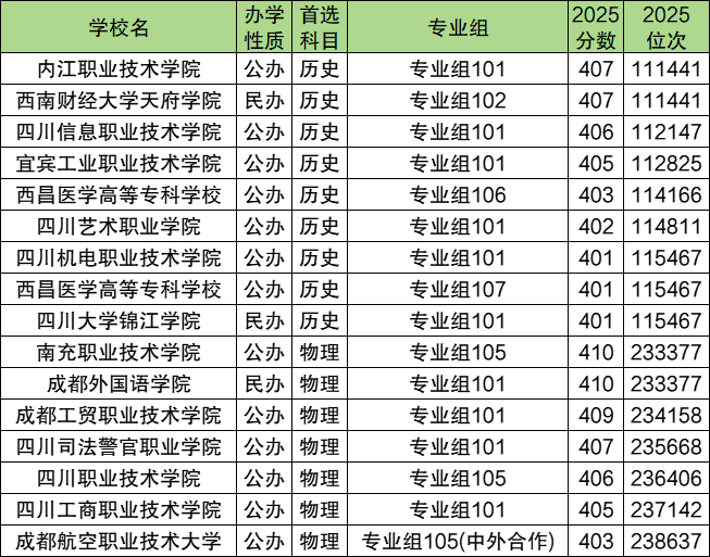 四川省历史类400分左右的大学有9所,物理类400分左右的大学7所,全部都在专科批录取。属于公办性质的有:内江职业技术学院专业组101(历史类407分)、宜宾工业职业技术学院专业组101(历史类405分)、成都工贸职业技术学院专业组101(物理类409分)、四川工商职业技术学院专业组101(405分)。