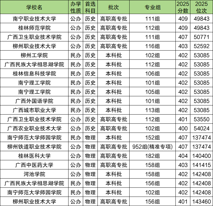广西省历史类400分左右的大学有13所,既有本科也有专科;物理类400分左右的大学有8所,既有本科也有专科。