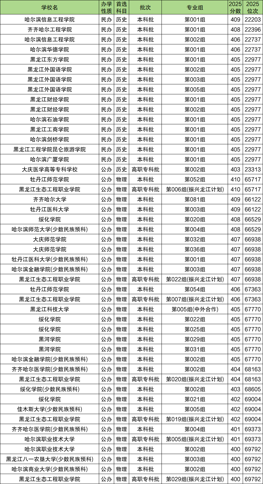 黑龙江400分左右能上的大学专业组有47所,其中历史类公办大学为专科,是大庆医学高等专科学校第002组(403分)。物理类考生400分左右可以选择的公办本科有大庆师范学院第032组(407分)、牡丹江师范学院第054组(406分)、绥化学院第021组(402分)等。