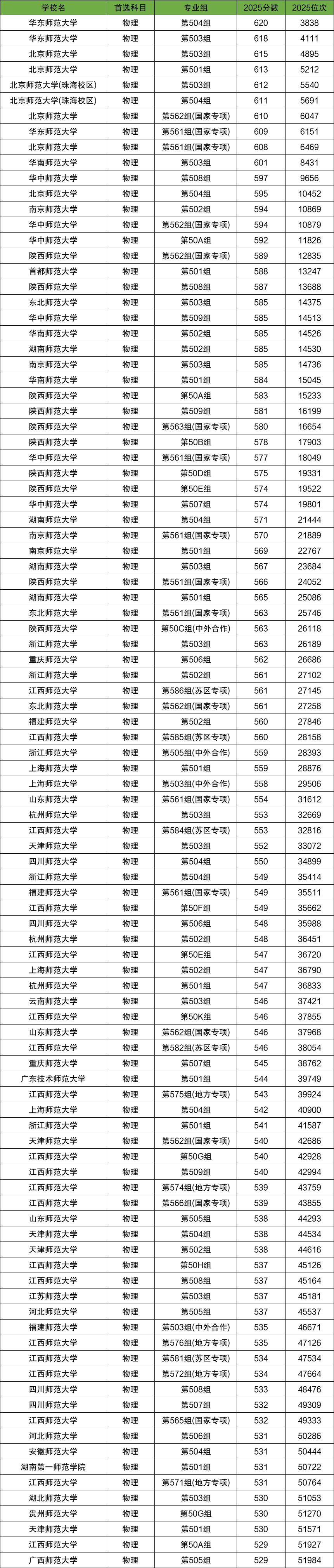 小编以2025年江西的招生数据为例,在江西物理类中,师范院校最高分是620,对应的是华东师范大学第504组;最低分是429,对应的是琼台师范学院第502组(中外合作)。