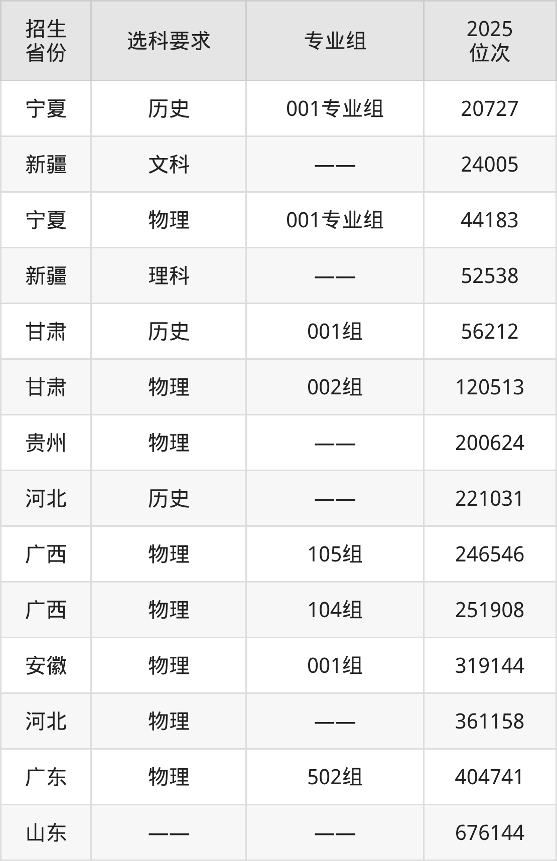 新疆科技职业技术学院2025年在全国各省的位次差异较大,最高位次是20727位(宁夏历史类)、最低位次是676144位(山东)。各省具体位次请看下图: