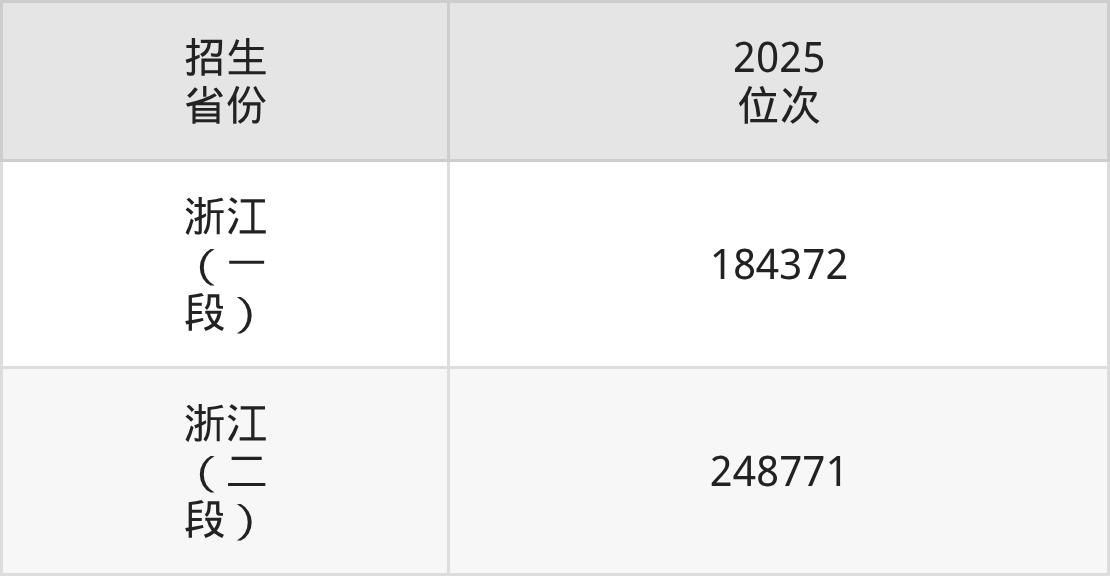浙江长征职业技术学院2025年的位次差异较大,最高位次是184372位(浙江)、最低位次是248771位(浙江)。具体位次请看下图: