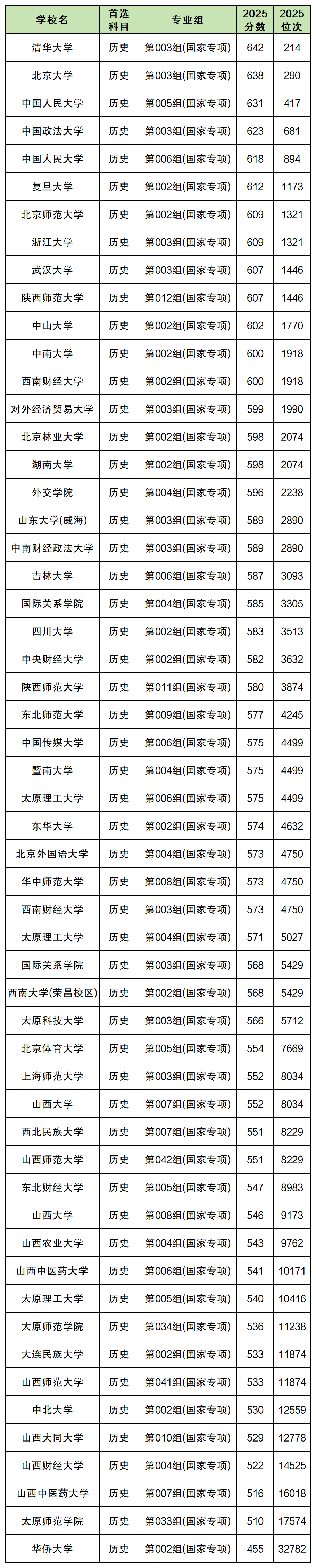 以下是2025年各大学国家专项计划在山西历史类的录取分数线一览表(需滑动查阅):