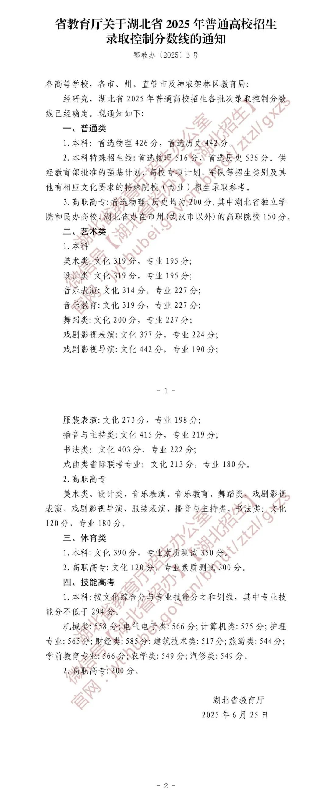 一、2025年湖北高考录取分数线