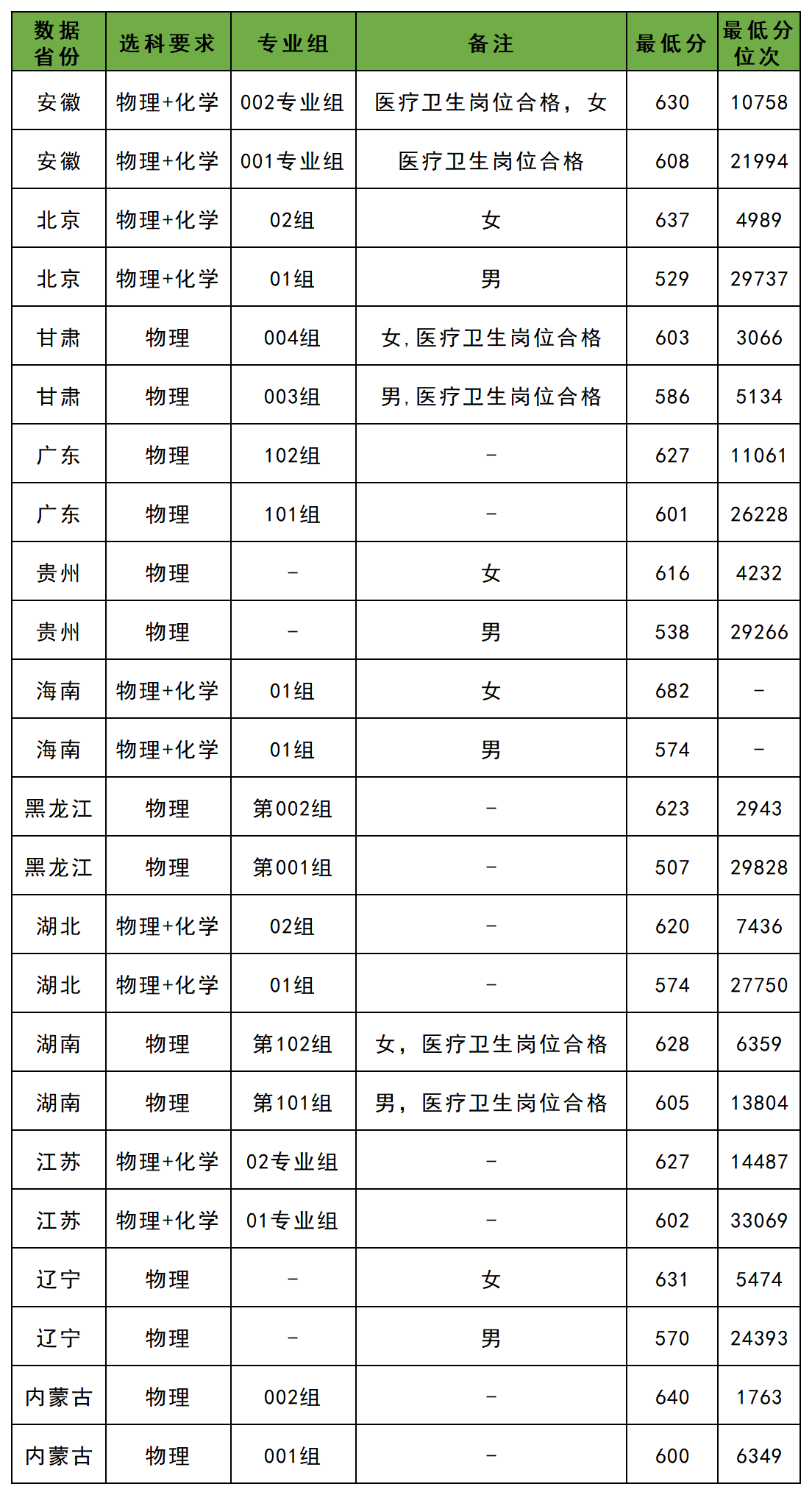 如2025年空军军医大学在安徽省物理类招生最低分为608分。在贵州物理类招生最低分为538分。