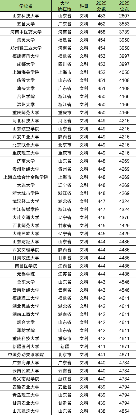 由于本文篇幅有限,仅为大家展示了录取分数线排名全国前50强二本大学名单。根据表格数据可得知,文科考生需考到438分以上、全省排名前4854位前,才能被这些好的二本大学录取。
