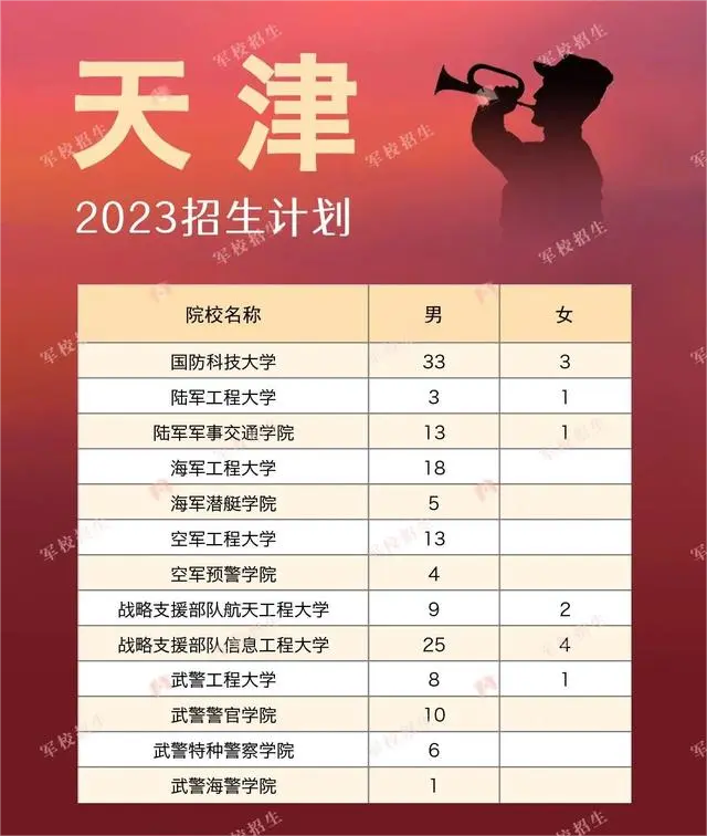 天津军校有国防科技大学、陆军工程大学、陆军军事交通学院等大学招生,想报考军校,就需要知道2023年天津高考军校有几所。本文将介绍2023年天津军校有哪些学校招生,以及在天津最低多少分才能上军校。