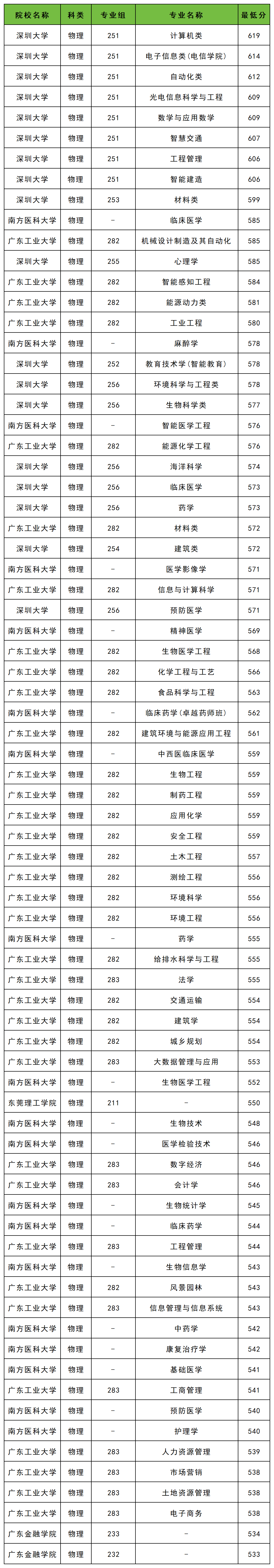 2025年广东地方专项物理类录取分数线位于533分到619分之间,收分最低的是广东金融学院232组,收分最高的是深圳大学计算机类专业,各校各专业具体分数线如下。