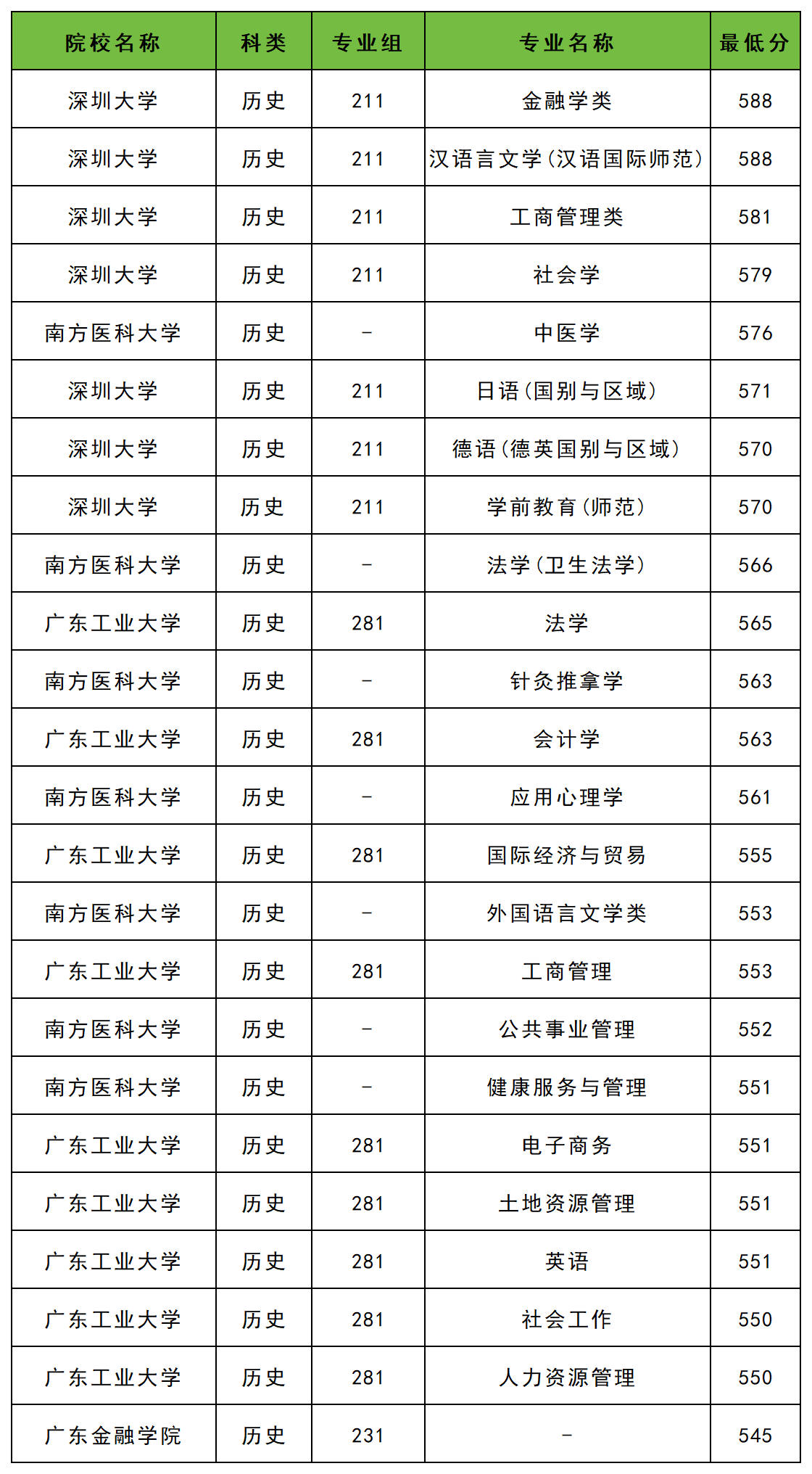 2025年广东地方专项历史类录取分数线位于545分到588分之间,各学校各专业最低分如下。