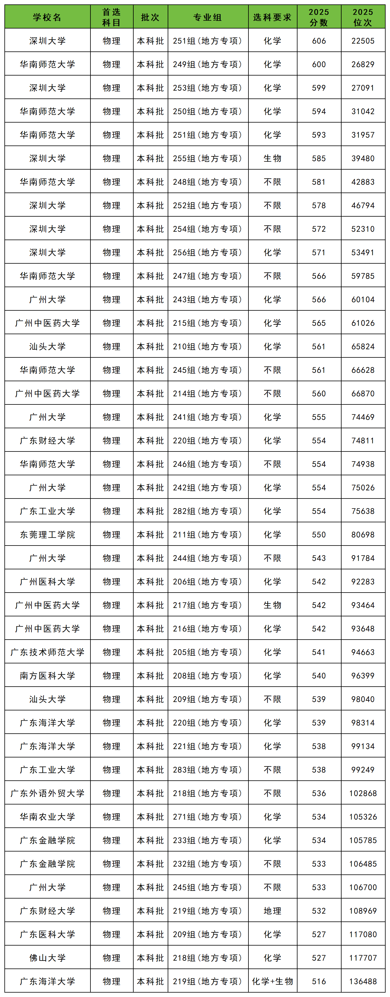 2025年广东地方专项计划大学物理类录取分数线一览表: