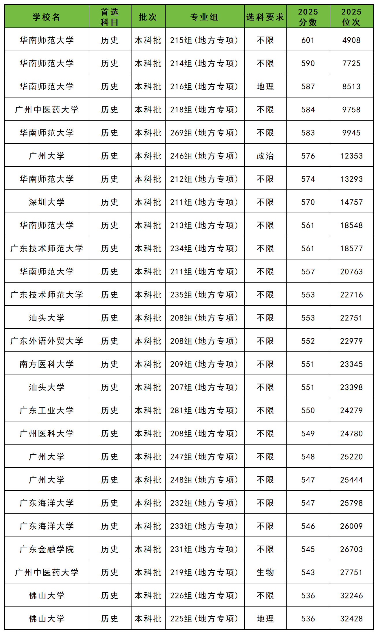 2025年广东地方专项历史类录取分数线位于536分到601分之间,各学校各专业组最低分如下。
