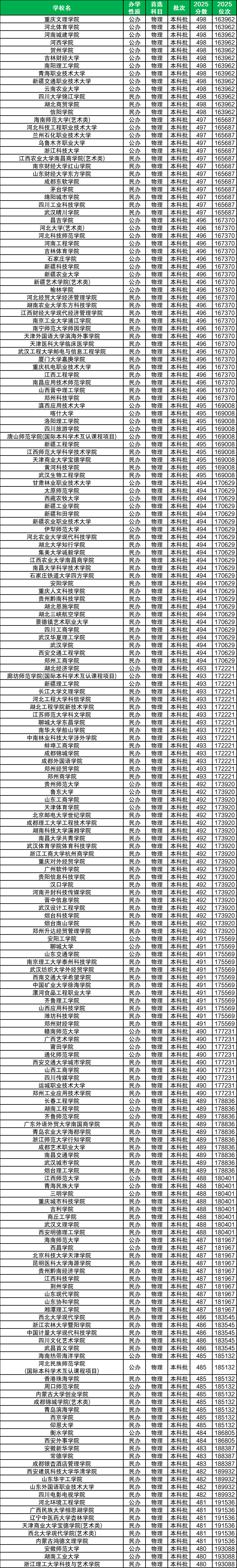 (二)2025全国二本大学录取分数线表:342分-498分
