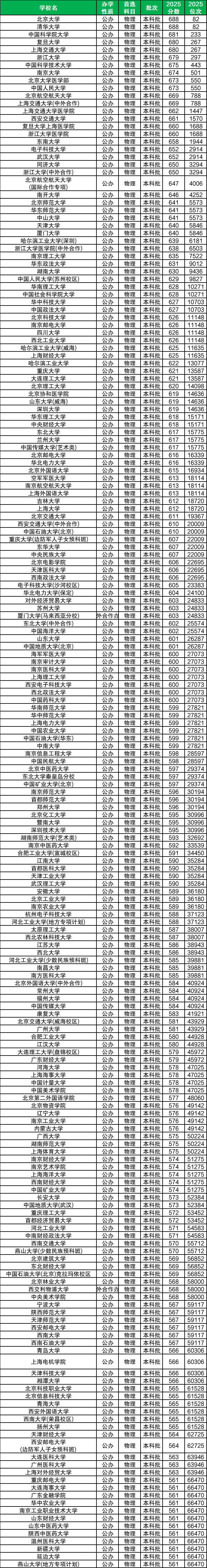 (一)2025全国一本大学录取分数线表:499分-688分