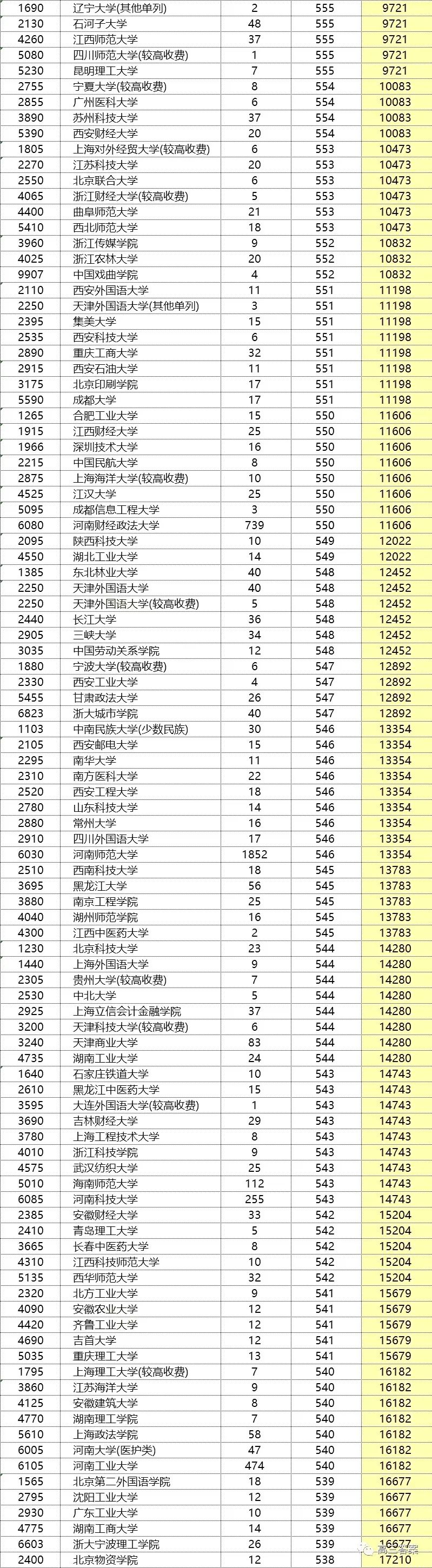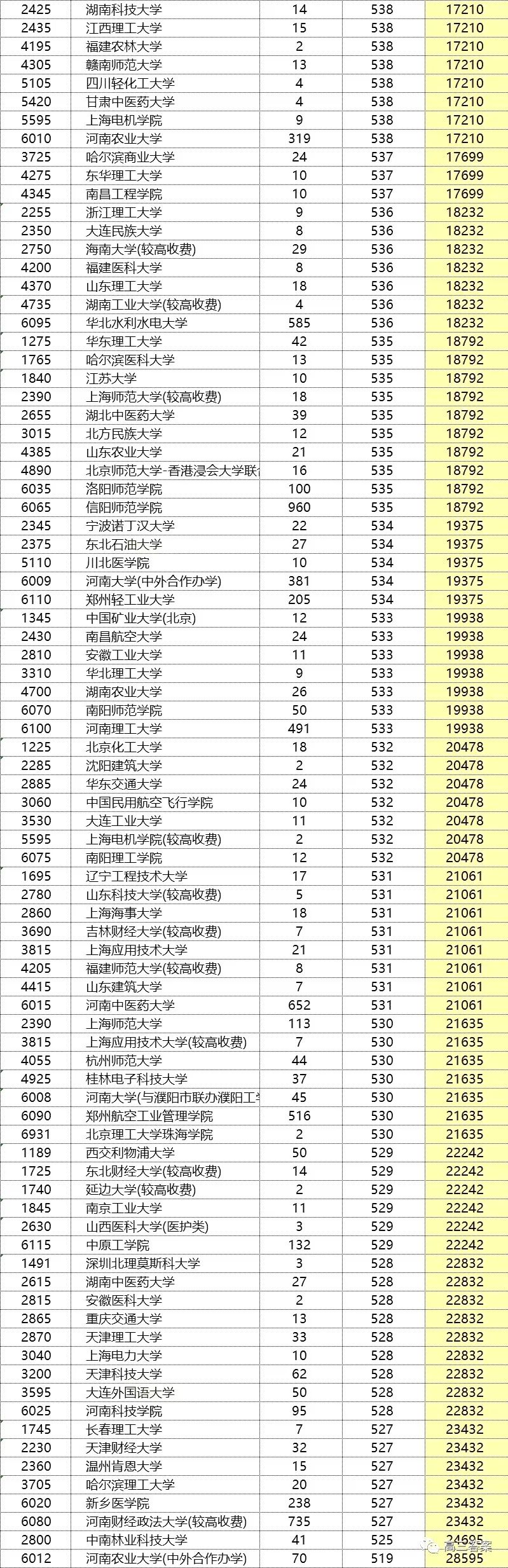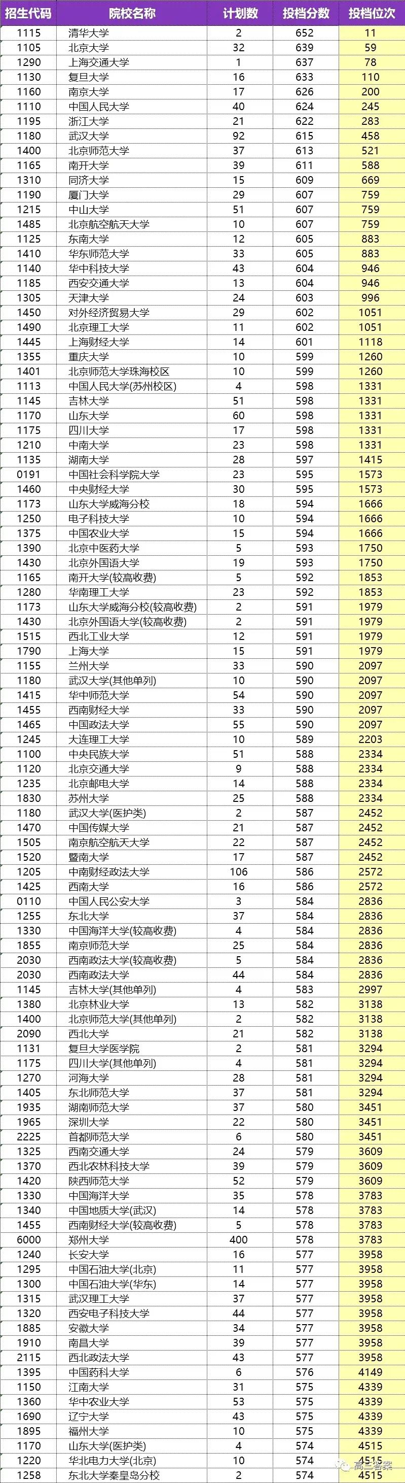 文科方面,清华大学最低投档分652分,超出一本线125分;北京大学最低投档线639分,超出一本线112分;郑州大学最低投档分578分,超出一本线51分;河南大学最低投档分567分,超出一本线40分。