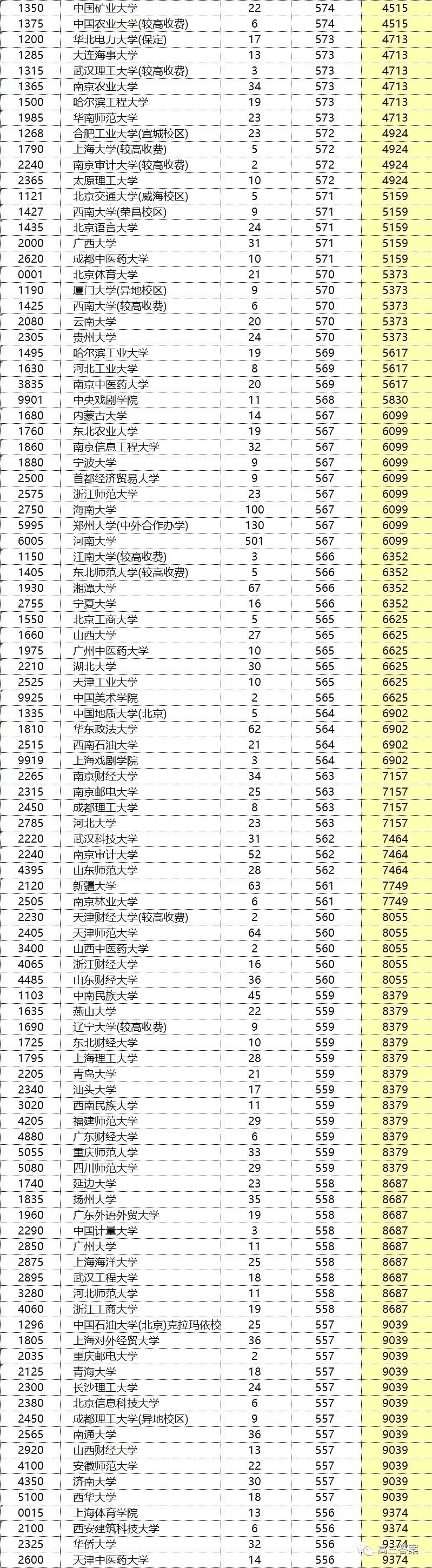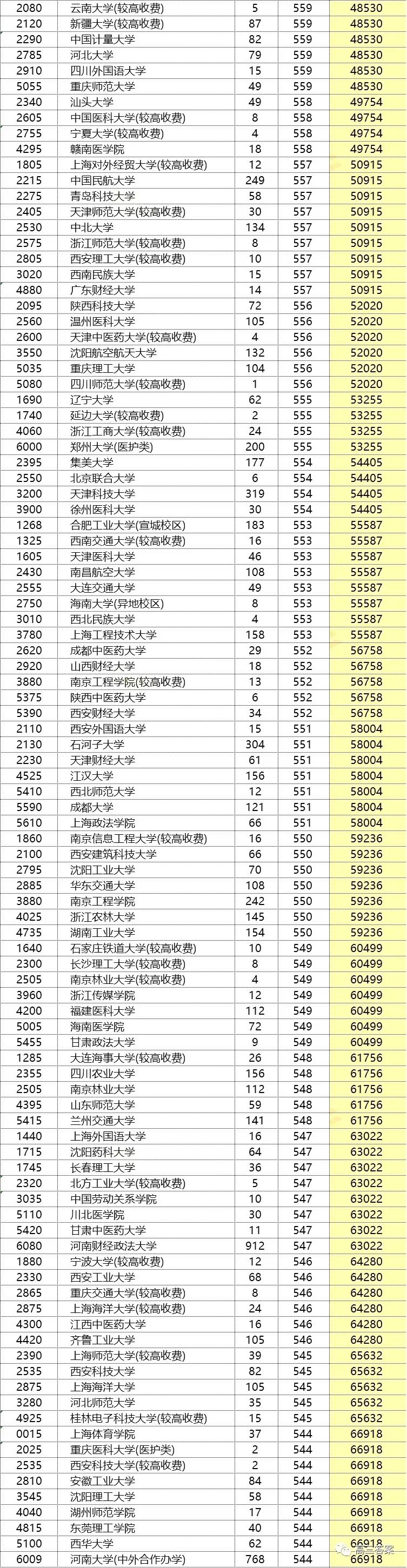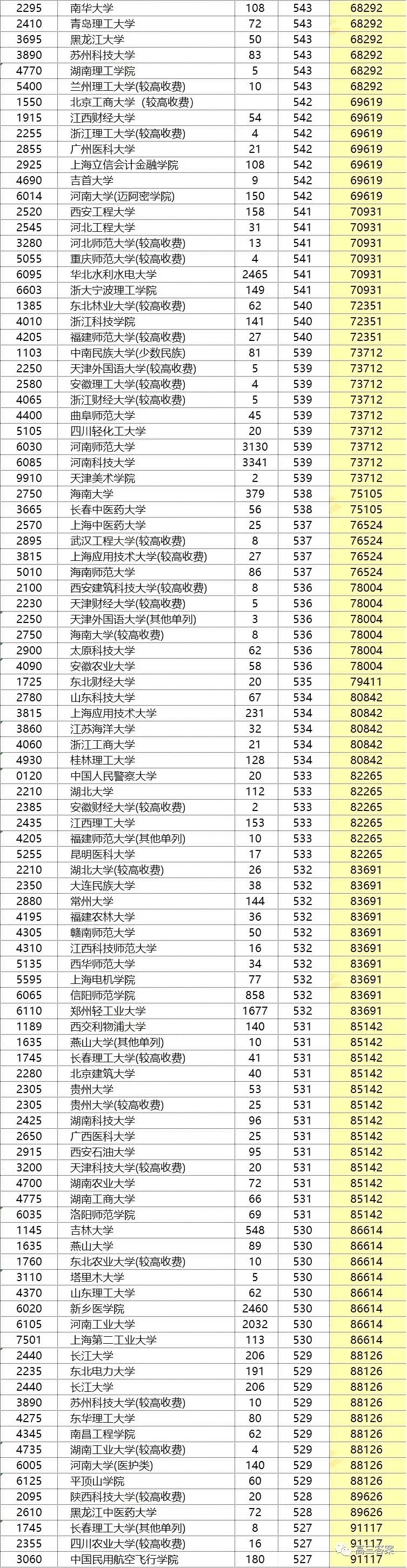 文科方面,清华大学最低投档分652分,超出一本线125分;北京大学最低投档线639分,超出一本线112分;郑州大学最低投档分578分,超出一本线51分;河南大学最低投档分567分,超出一本线40分。