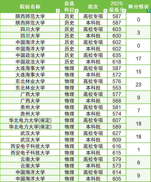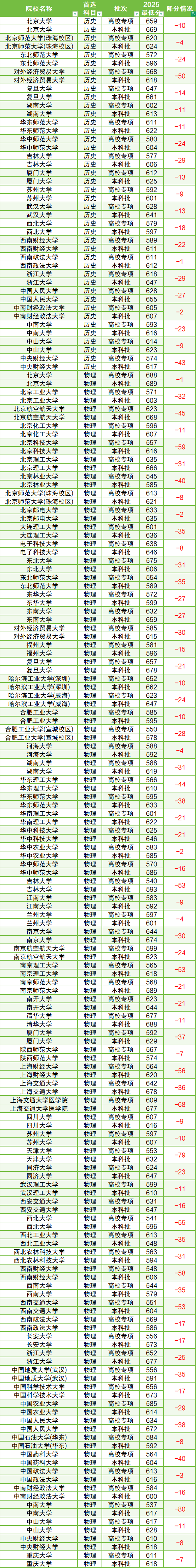 注:下文使用的数据为2025年分数,且每年大学降分情况会有差异,具体跟科类、当年招生计划、院校报考人数的变化等有关,因此降分表不能作为唯一参考标准,2026届考生还需综合多方面因素择校。