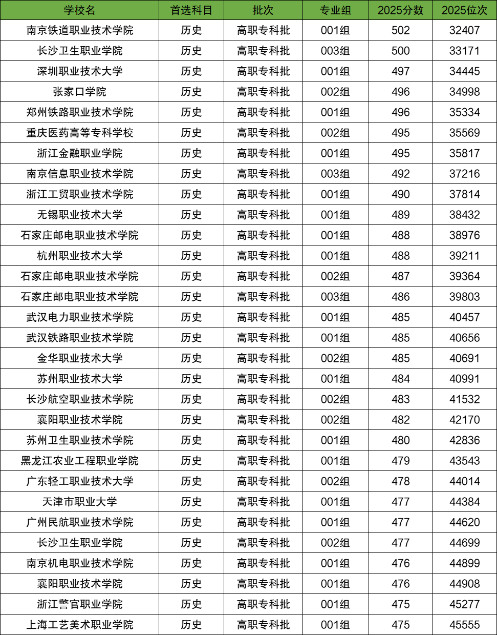 全国专科大学在安徽历史类录取分数线最高的院校专业组是南京铁道职业技术学院001组,2025年最低录取分数线是502分,最低位次为32407位;