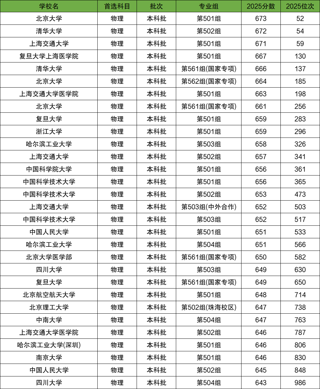 全国本科大学在江西物理类录取分数线最高的院校专业组是北京大学第501组,2025年最低录取分数线是673分,最低位次是52位;