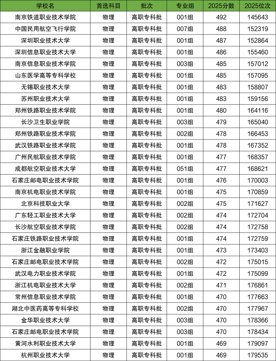 全国专科大学在安徽物理类录取分数线最高的院校专业组是南京铁道职业技术学院001组,2025年最低录取分数线是492分,最低位次为145643位;