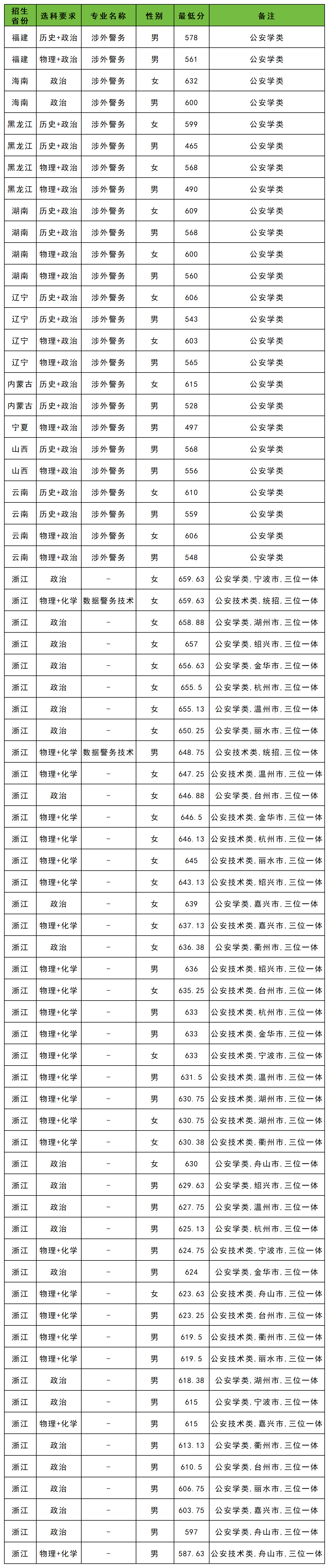 如2025年浙江警察学院在黑龙江省物理类招生最低分为490分,历史类招生最低分为465分。在海南招生最低分为600分。