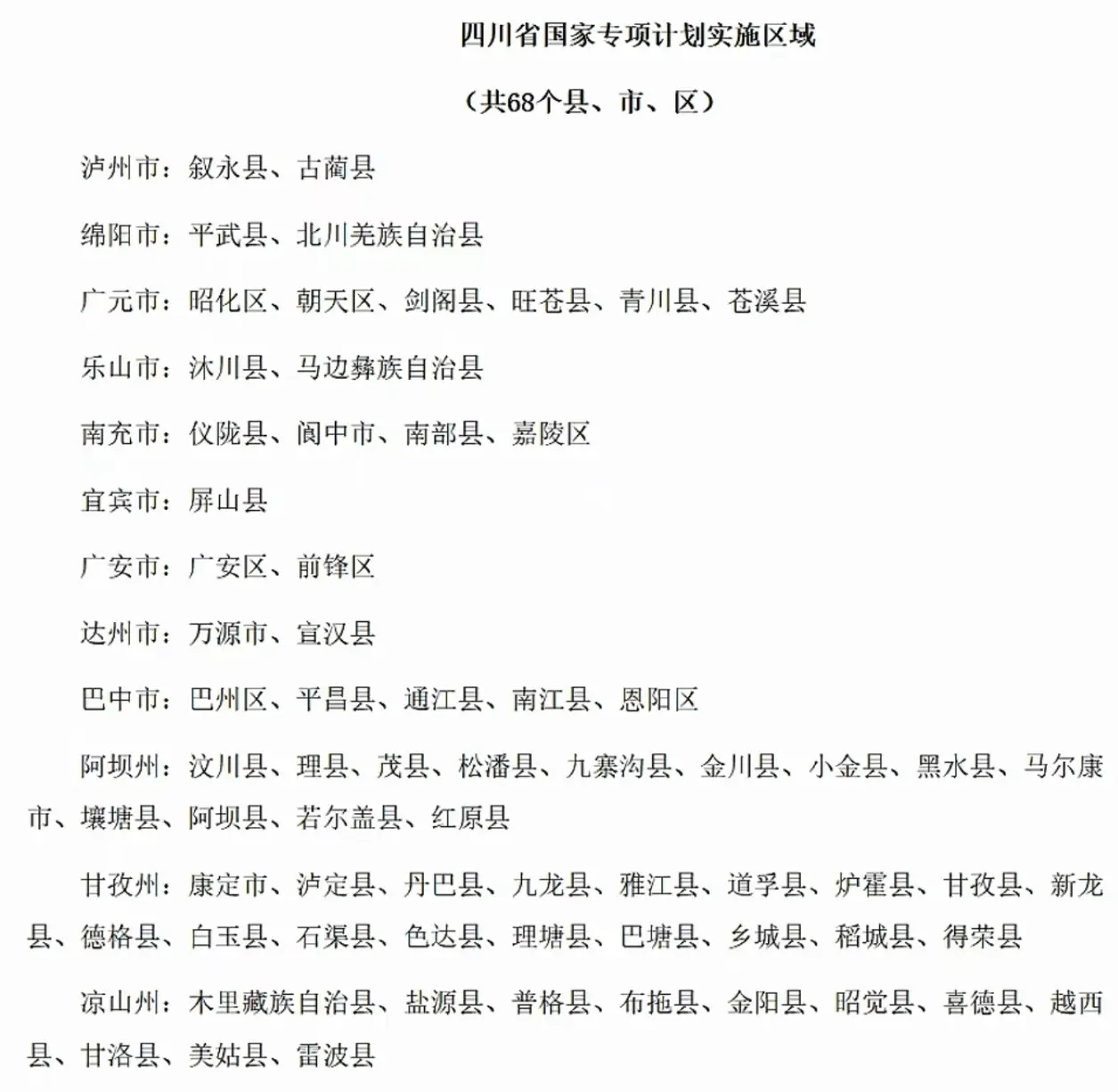 2026四川高校专项计划实施区域涵盖涵盖12个州市共68个县(市、区),包括泸州市叙永县、古蔺县;广元市昭化区、朝天;广安市广安区、前锋区等,具体实施区域名单如下:
