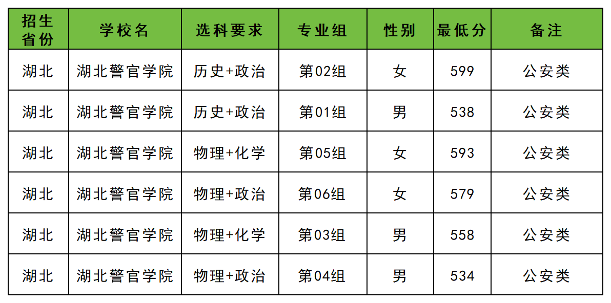 如2025年湖北警官学院在湖北省物理类招生最低分为534分,历史类招生最低分为538分。