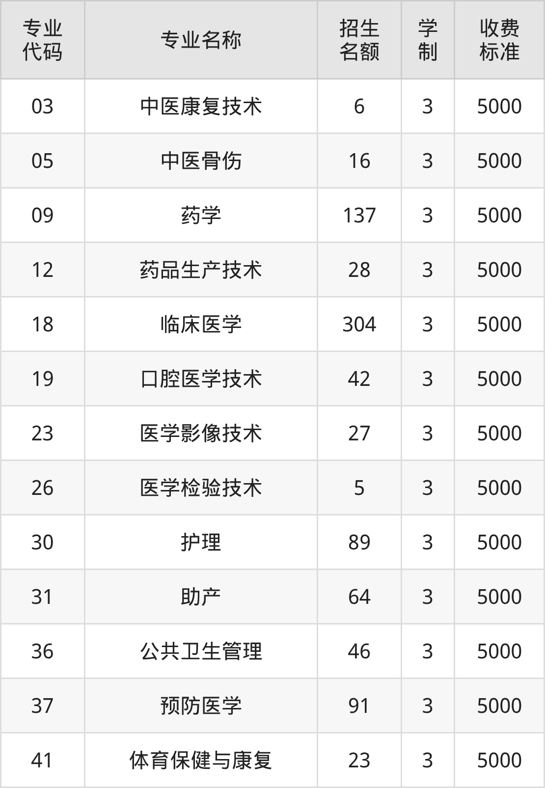 保山中医药高等专科学校中医学专业在专科批历史类招122人,学制3年,专业招生代码是04,学费是5000元一年。保山中医药高等专科学校针灸推拿专业在专科批历史类招80人,学制3年,专业招生代码是05,学费是5000元一年。