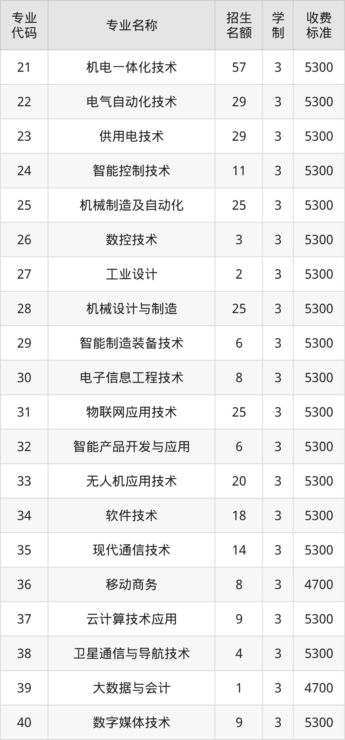| 01 | 机电一体化技术 | 30 | 3 | 5300 |