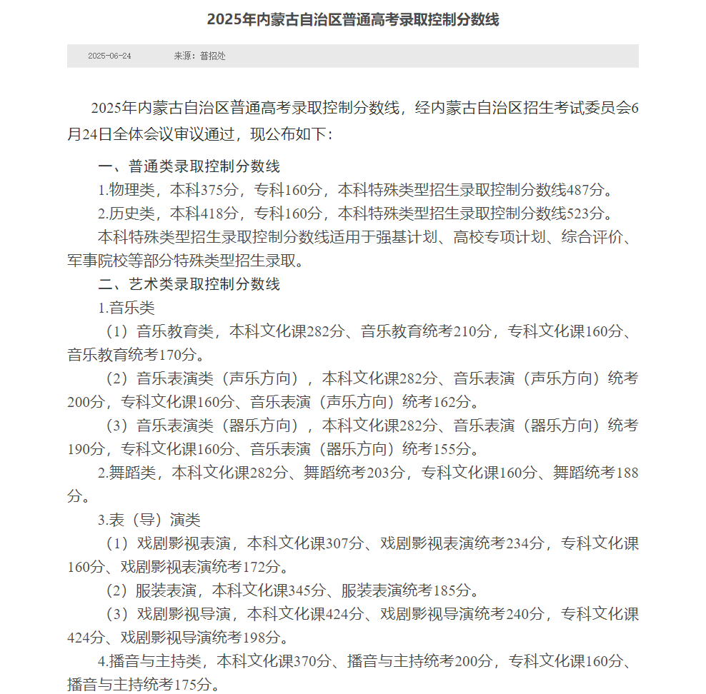 2025年内蒙古高考分数线为:特控线为523分、本科为418分、专科为160分,此为历史类批次线。 关于2025内蒙古高考更多分数线及一分一段表详情,本文都进行了整理,供查阅。