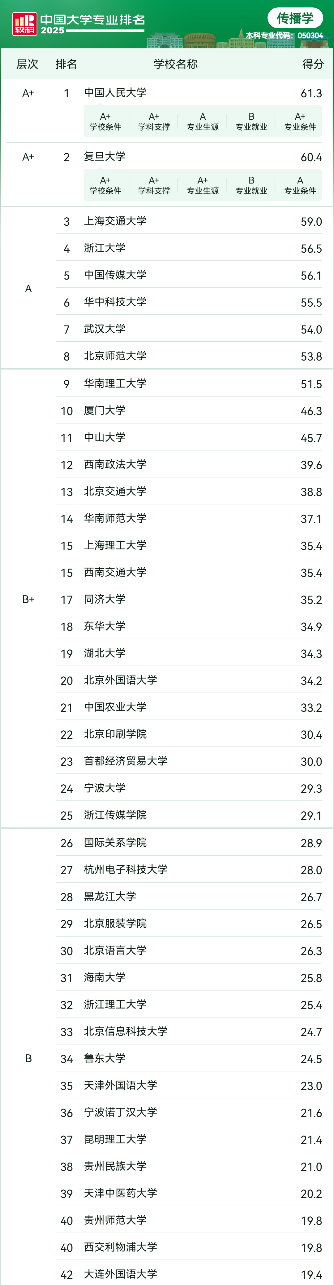 传播学专业大学排名如下(滑动查阅):