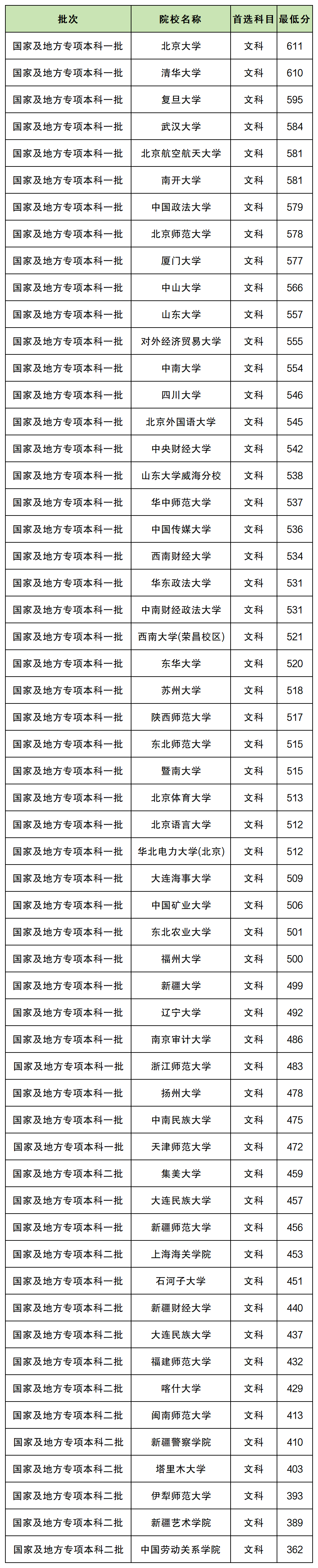 2025年各大学国家专项计划在新疆文科的录取分数线在362分-611分之间,录取分数最高的是北京大学,最低分为611分;最低录取分数超过570分的还有: