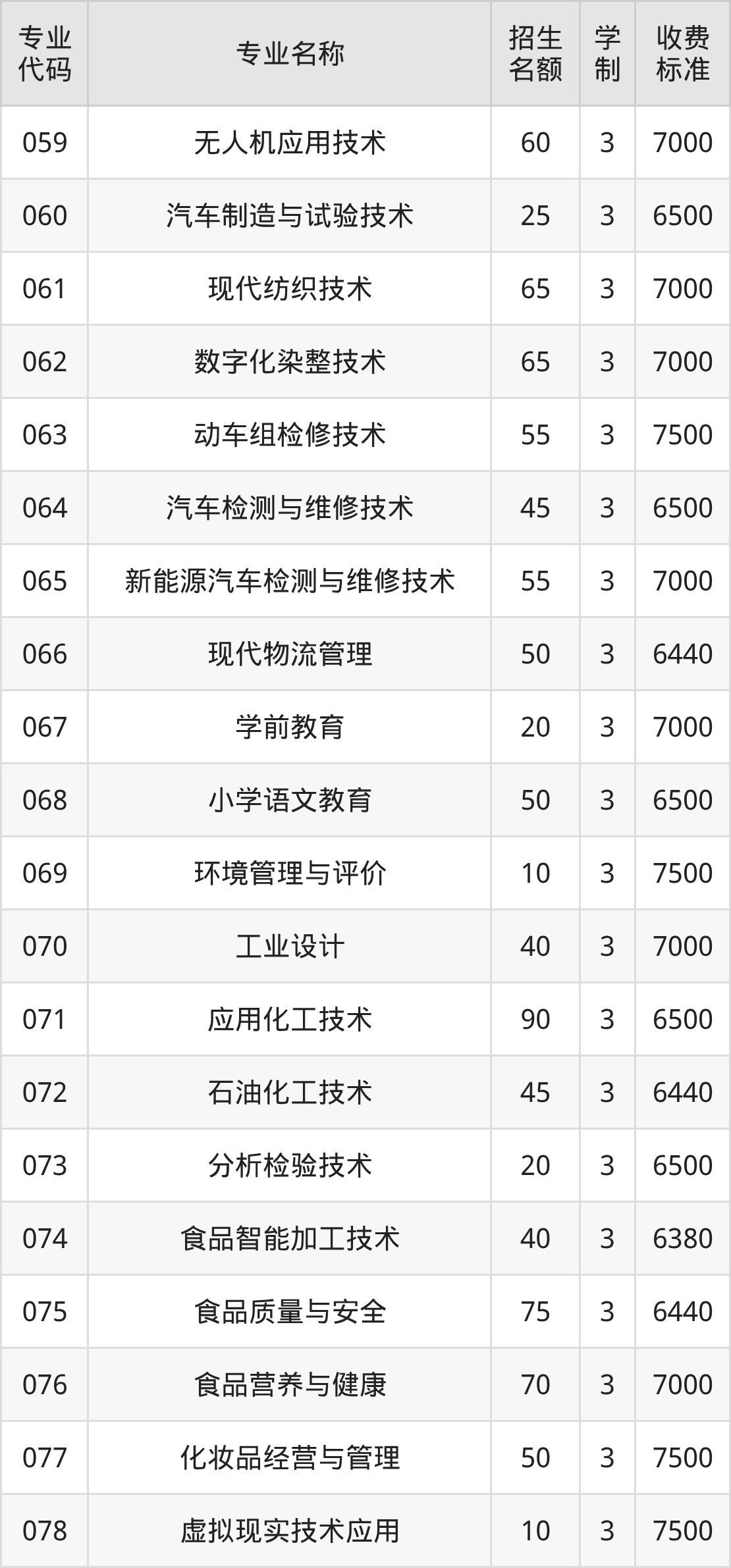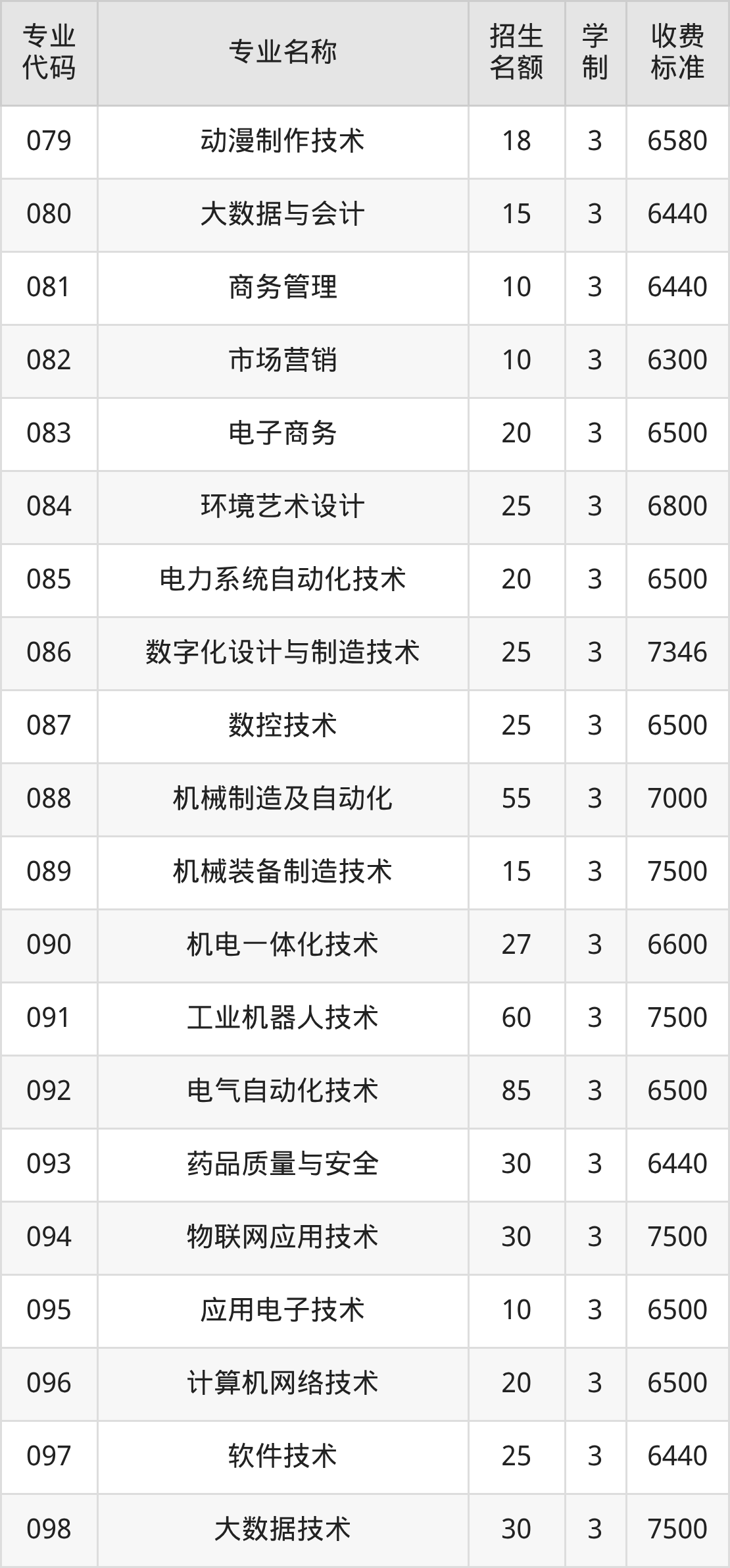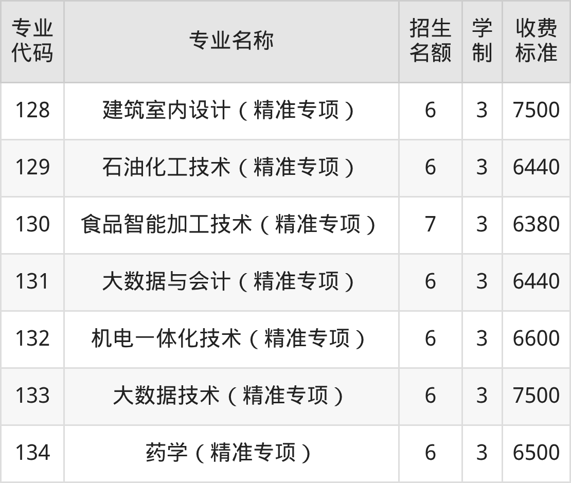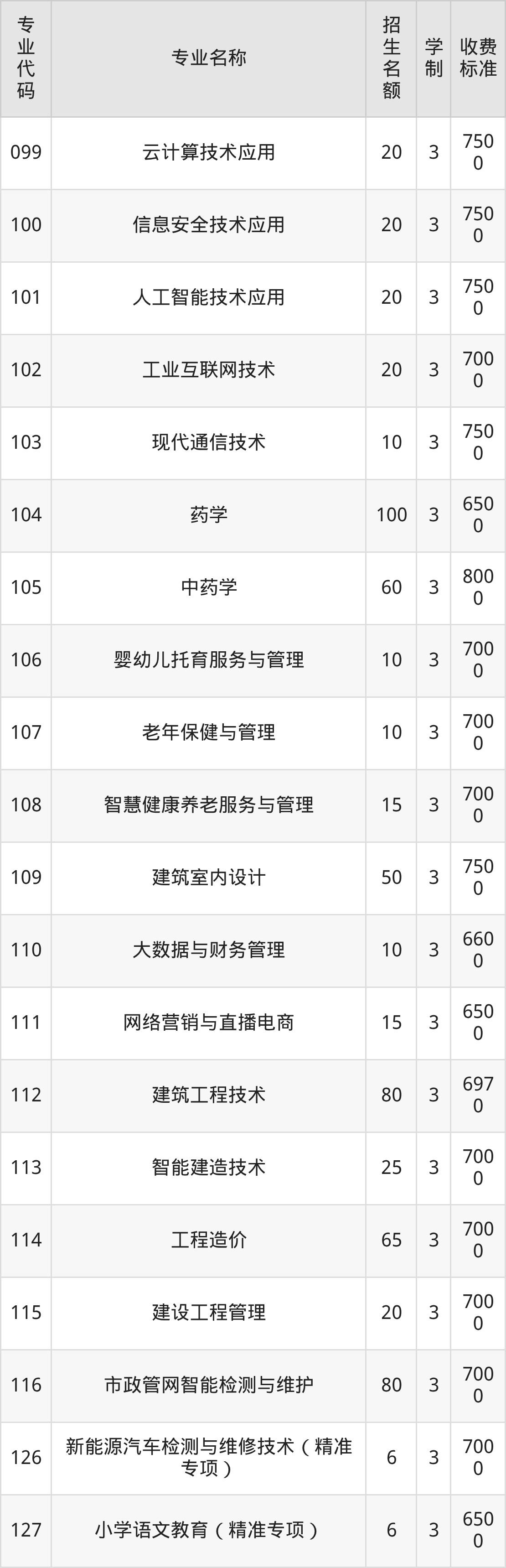 | 专业 代码 | 专业名称 | 招生 名额 | 学 制 | 收费 标准 |
