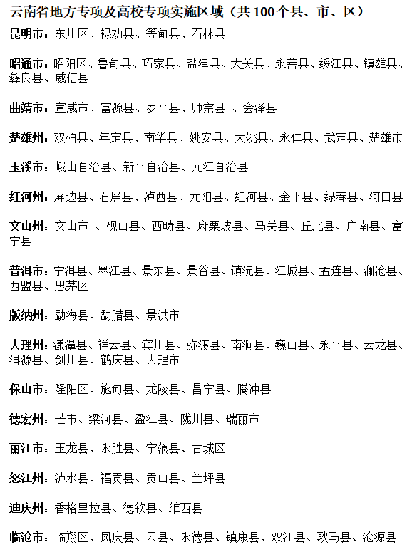 2026云南地方专项计划实施区域涵盖16个州市共100个县(市、区),与云南高校专项计划实施区域相同,包括昆明市东川区、禄劝县;曲靖市宣威市、富源县;楚雄州双柏县、年定县等,具体实施区域名单如下: