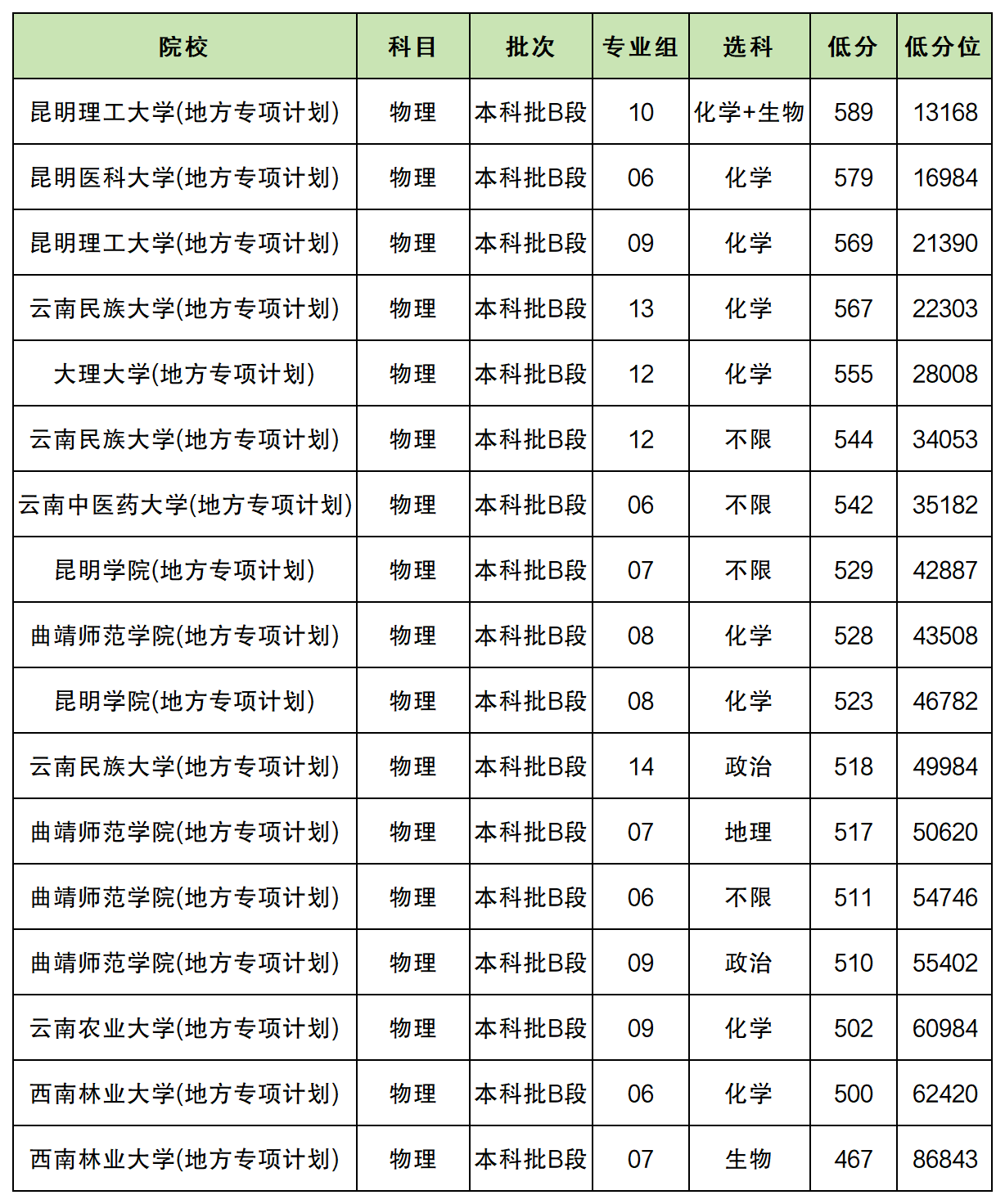 以下是2025年各大学地方专项计划在云南物理类的录取分数线一览表: