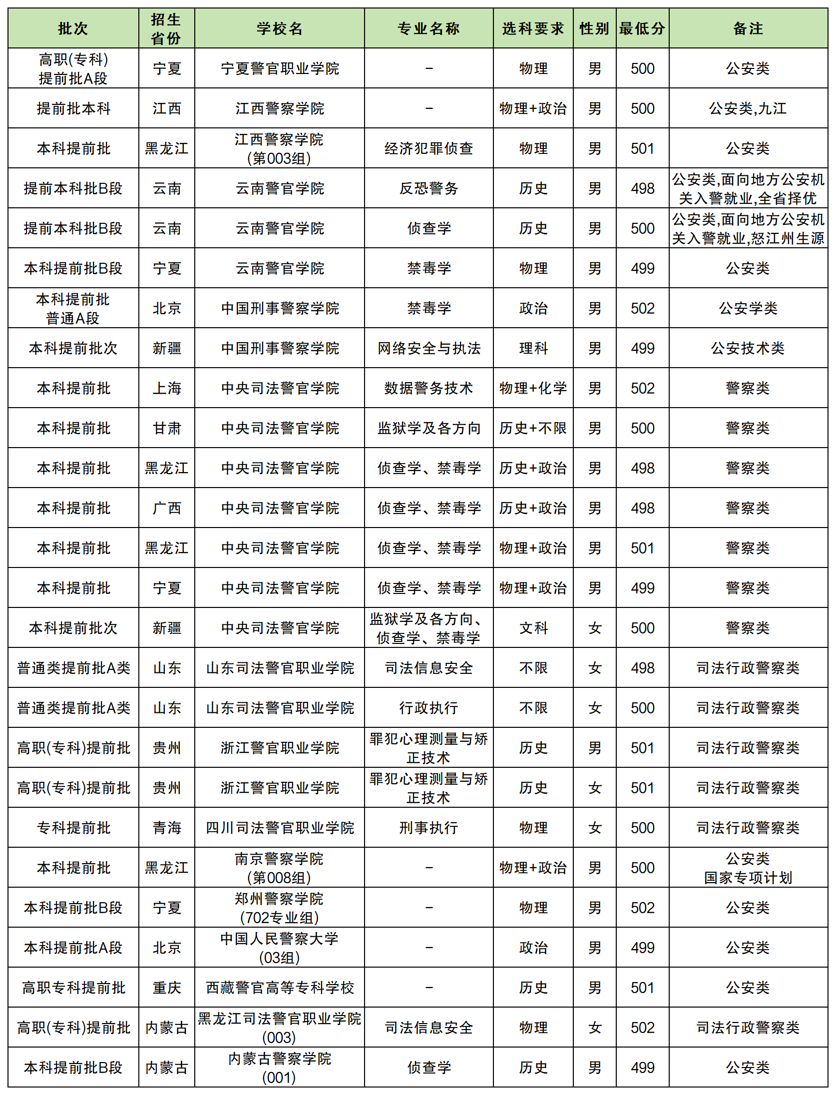 注:本文分数取值范围为498分~502分提前批能上的警校。