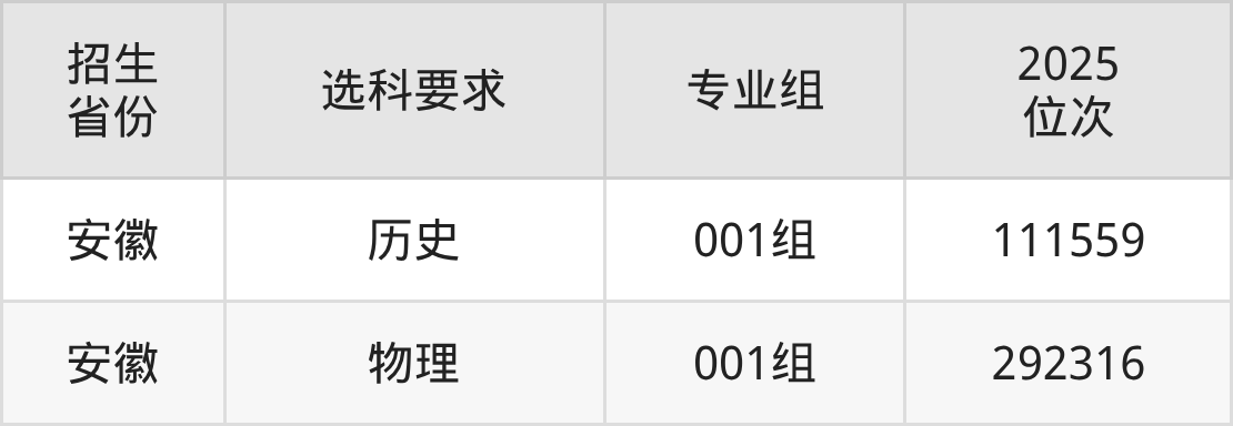 安徽黄梅戏艺术职业学院2025年的位次差异较大,最高位次是111559位(安徽历史类)、最低位次是292316位(安徽物理类)。具体位次请看下图: