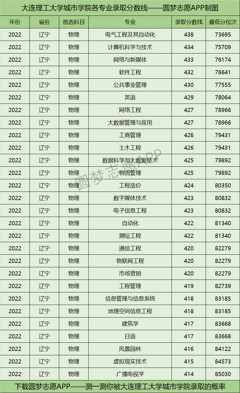 大连理工大学城市学院各专业录取分数线2022年是多少分?大连理工大学城市学院的最低分位次在全省排名多少?