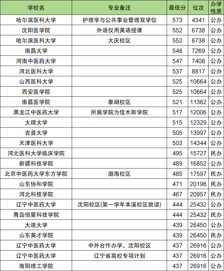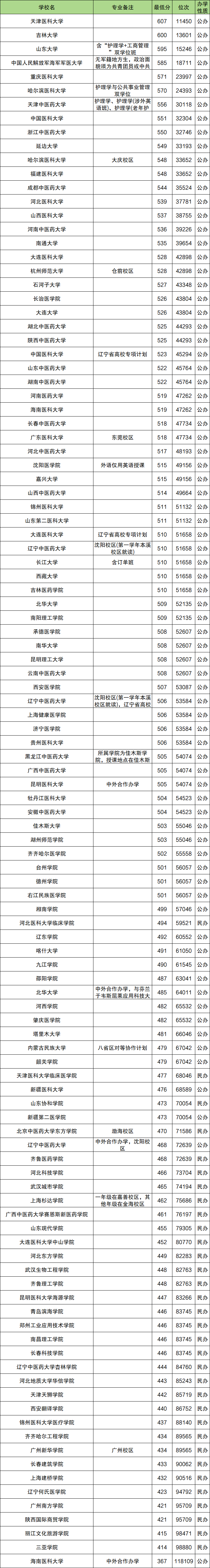(1)天津医科大学,最低分607分、位次11450名;
