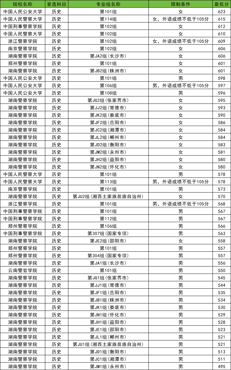 警校历史类女生录取分数线最高的是中国人民公安大学专业组第101组,2025年投档最低分623分;女生录取分数线最低的是湖南警察学院第JE2组(邵阳市),2025年投档最低分558分。