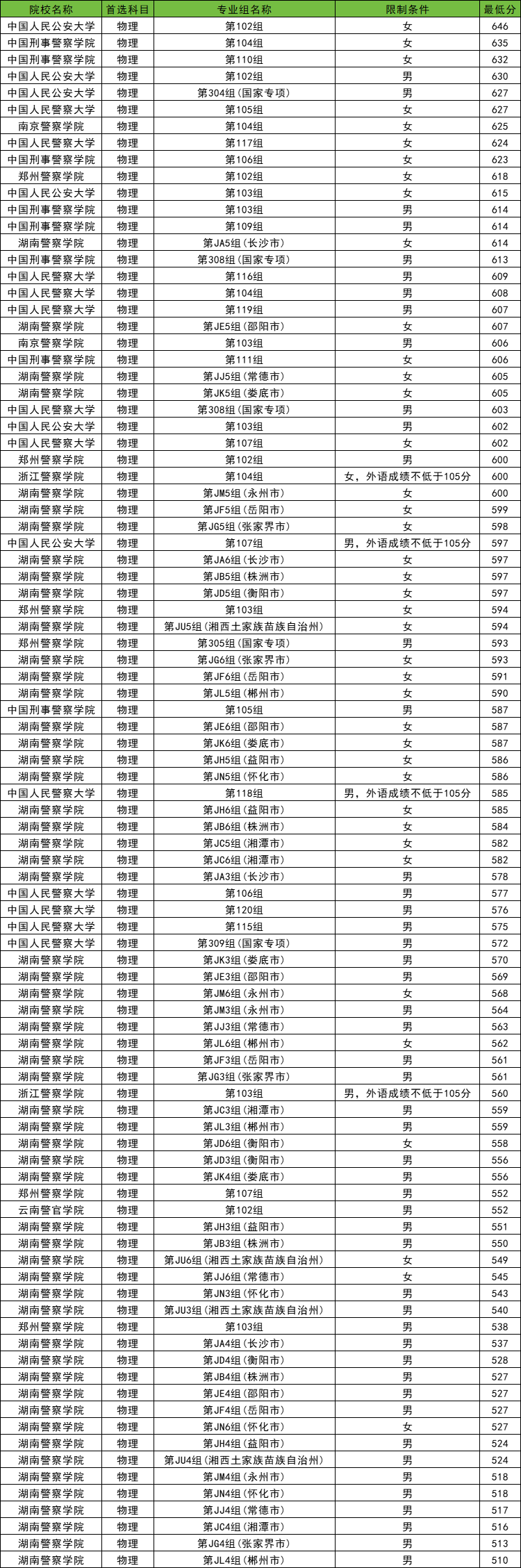 警校物理类女生录取分数线最高的是中国人民公安大学专业组第102组,2025年投档最低分646分;女生录取分数线最低的是湖南警察学院专业组第JN6组(怀化市),2025年投档最低分527分。