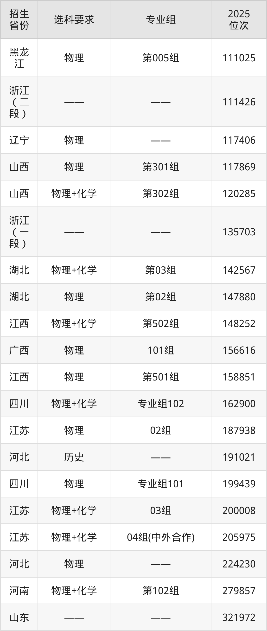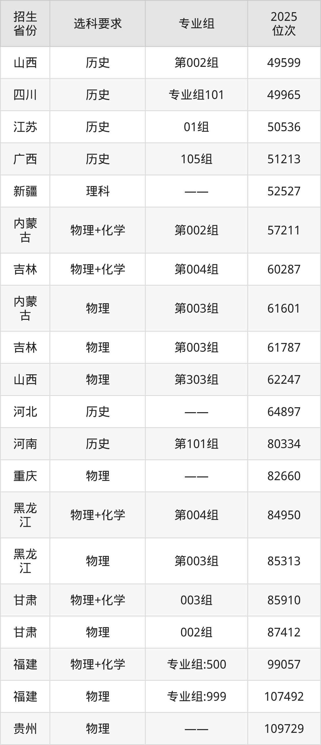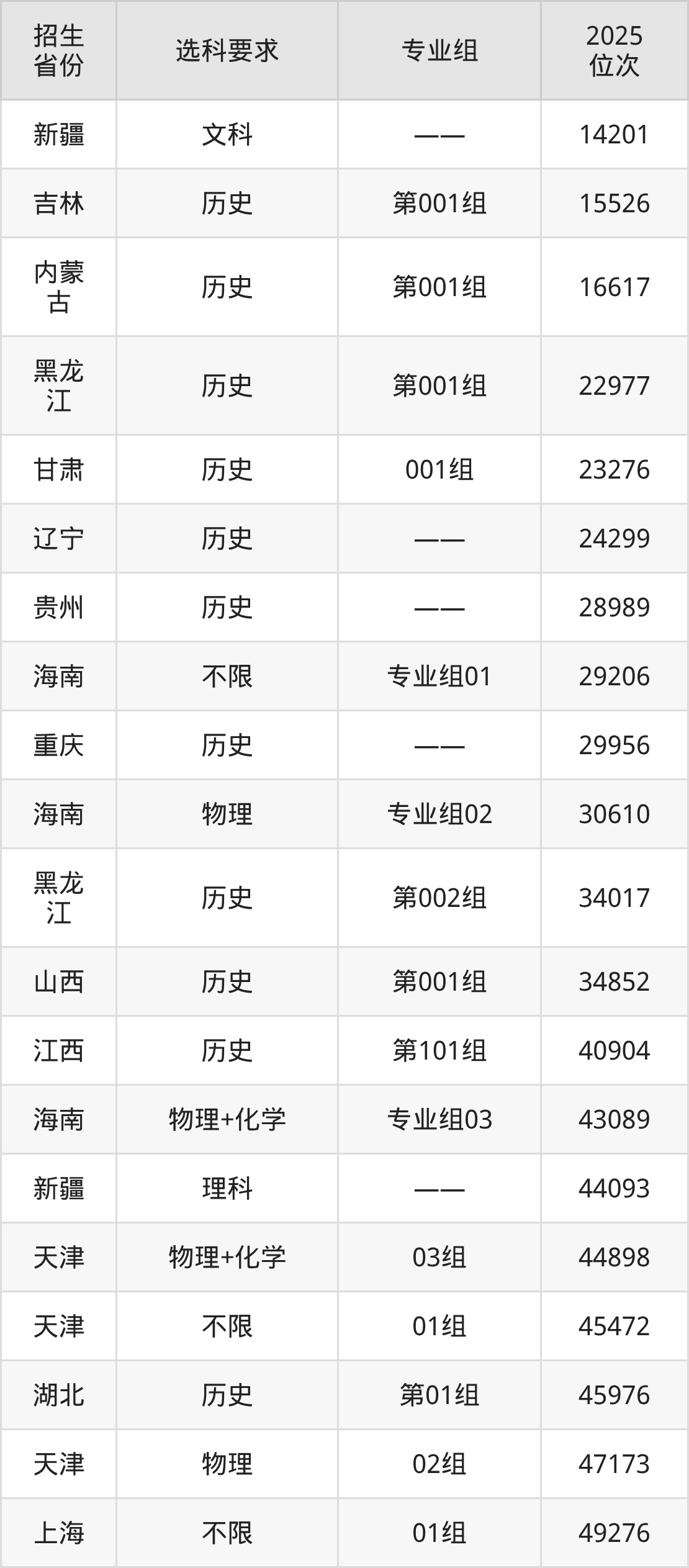 保定理工学院2025年在全国各省的位次差异较大,最高位次是14201位(新疆文科)、最低位次是351685位(河北物理类)。各省具体位次请看下图: