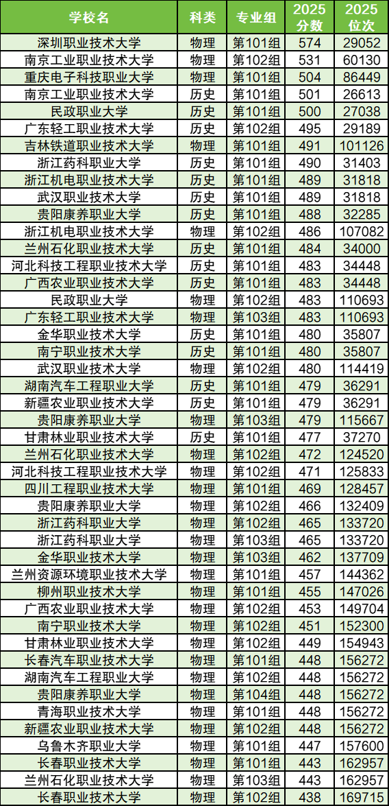 物理组:录取分数线最高的院校是深圳职业技术大学,学校101组2025年投档分为574分、最低投档位次为29052名。该分数已经超过了湖南师范大学(358组)、中国传媒大学(211组)、海南大学(117组)等211大学,是最难报考的物理类公办职业本科。