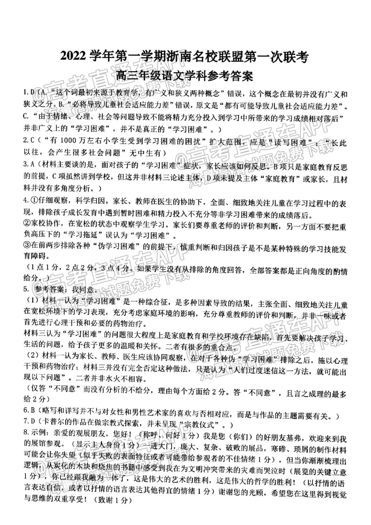 一.2023浙南名校(温州九校)高三十月联考语文试题及参考答案