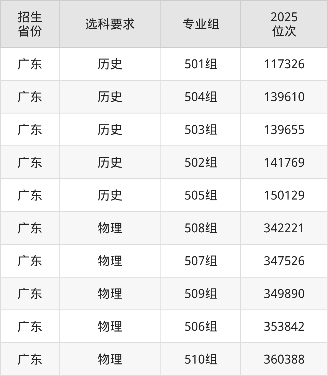 广东梅州职业技术学院2025年的位次差异较大,最高位次是117326位(广东历史类)、最低位次是360388位(广东物理类)。具体位次请看下图: