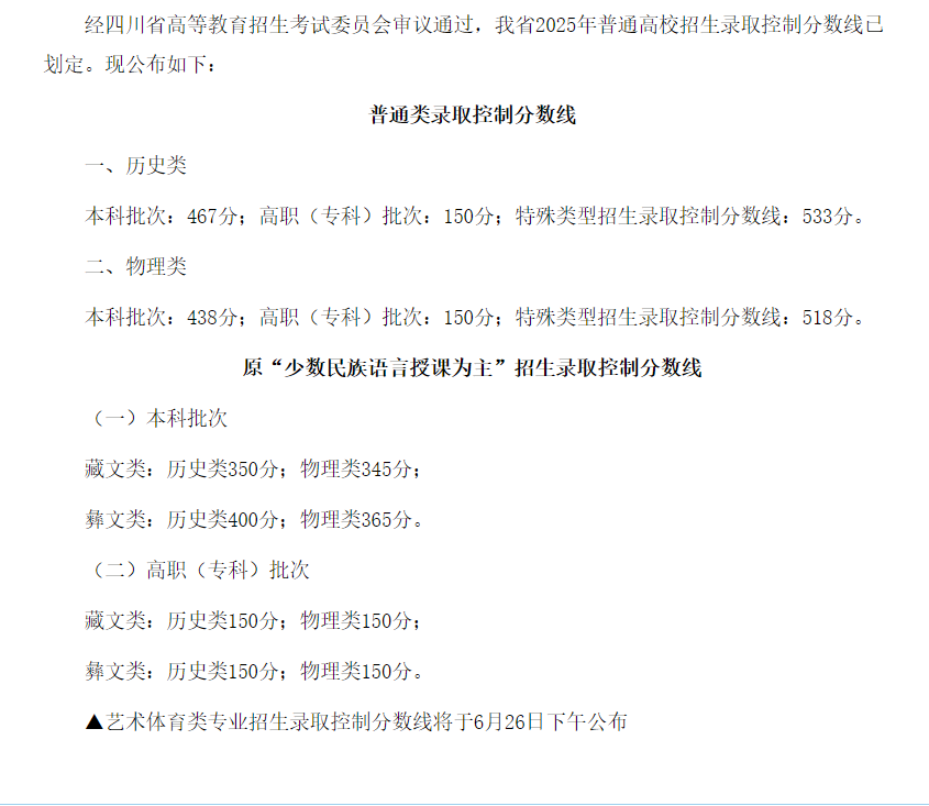 2025年四川高考分数线为:特控线为533分、本科为467分、高职(专科)为150分,此为历史类批次线。 关于2025四川高考更多分数线及一分一段表详情,本文都进行了整理,供查阅。